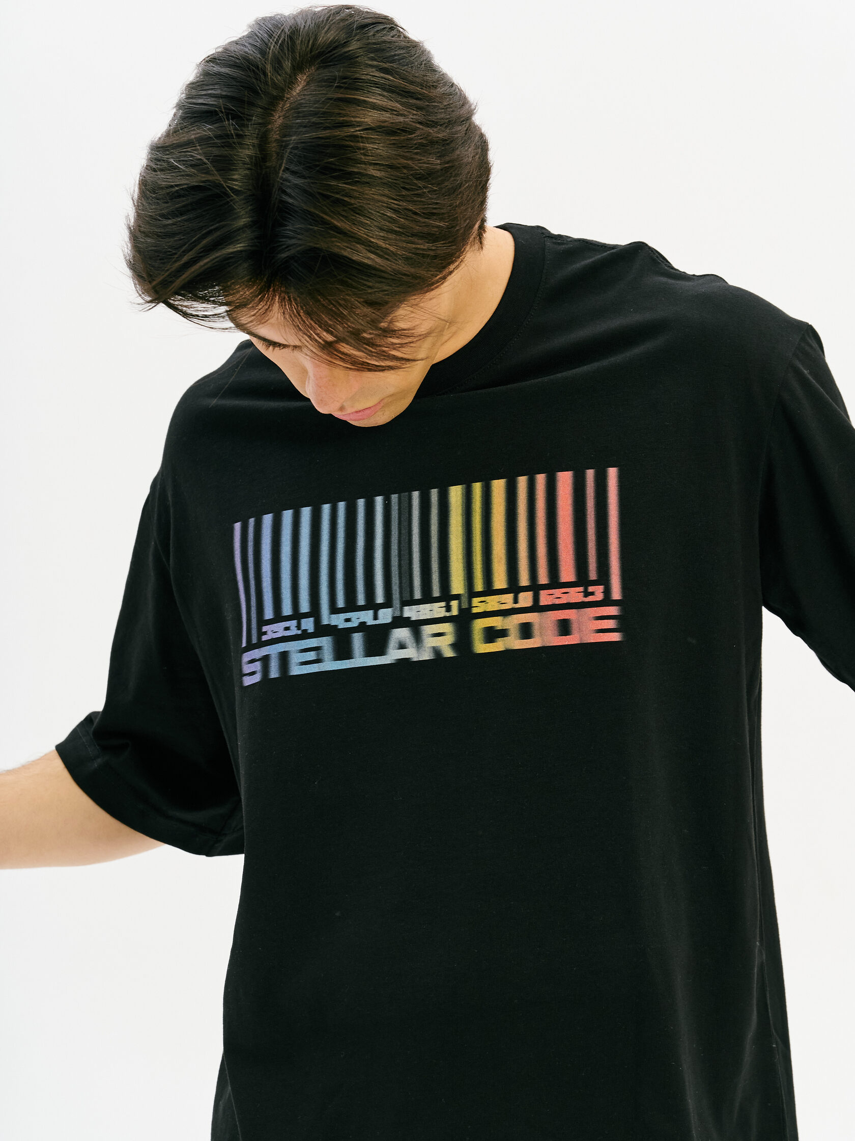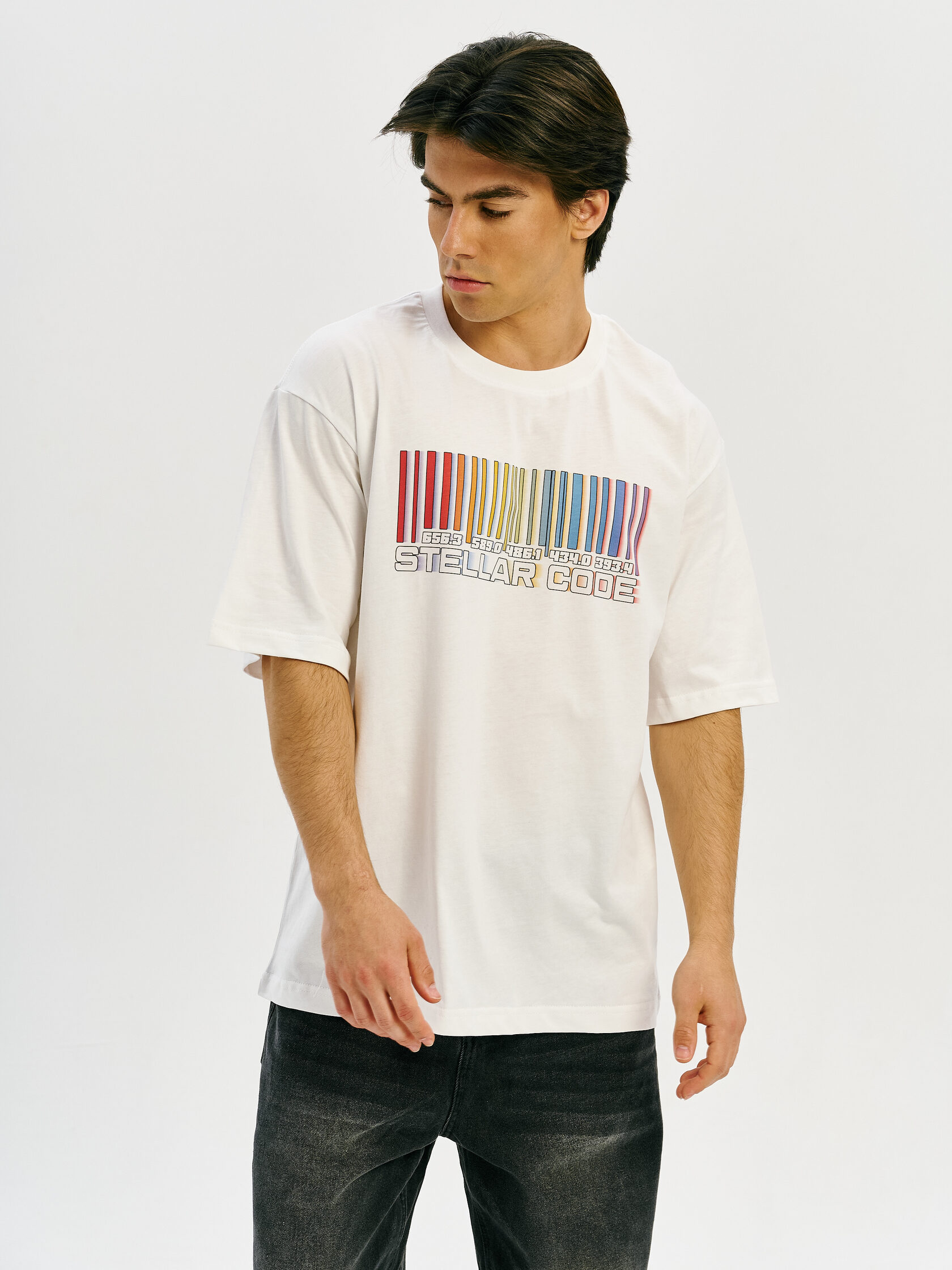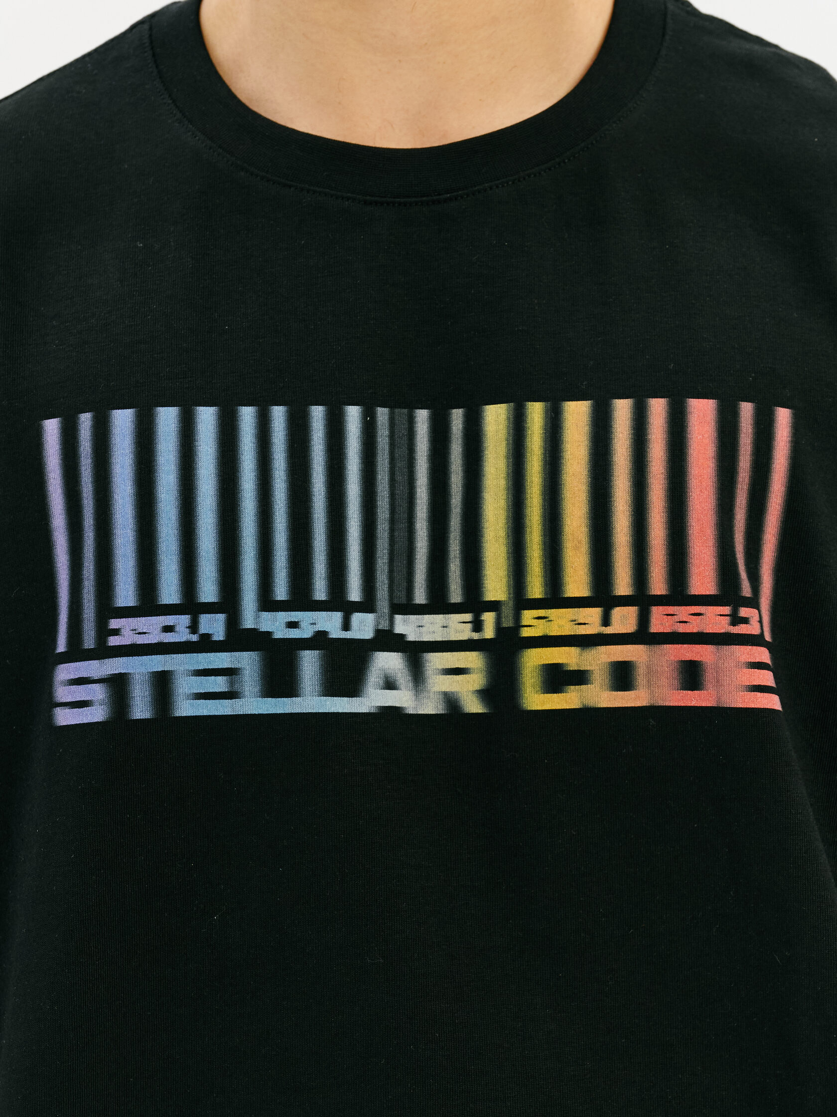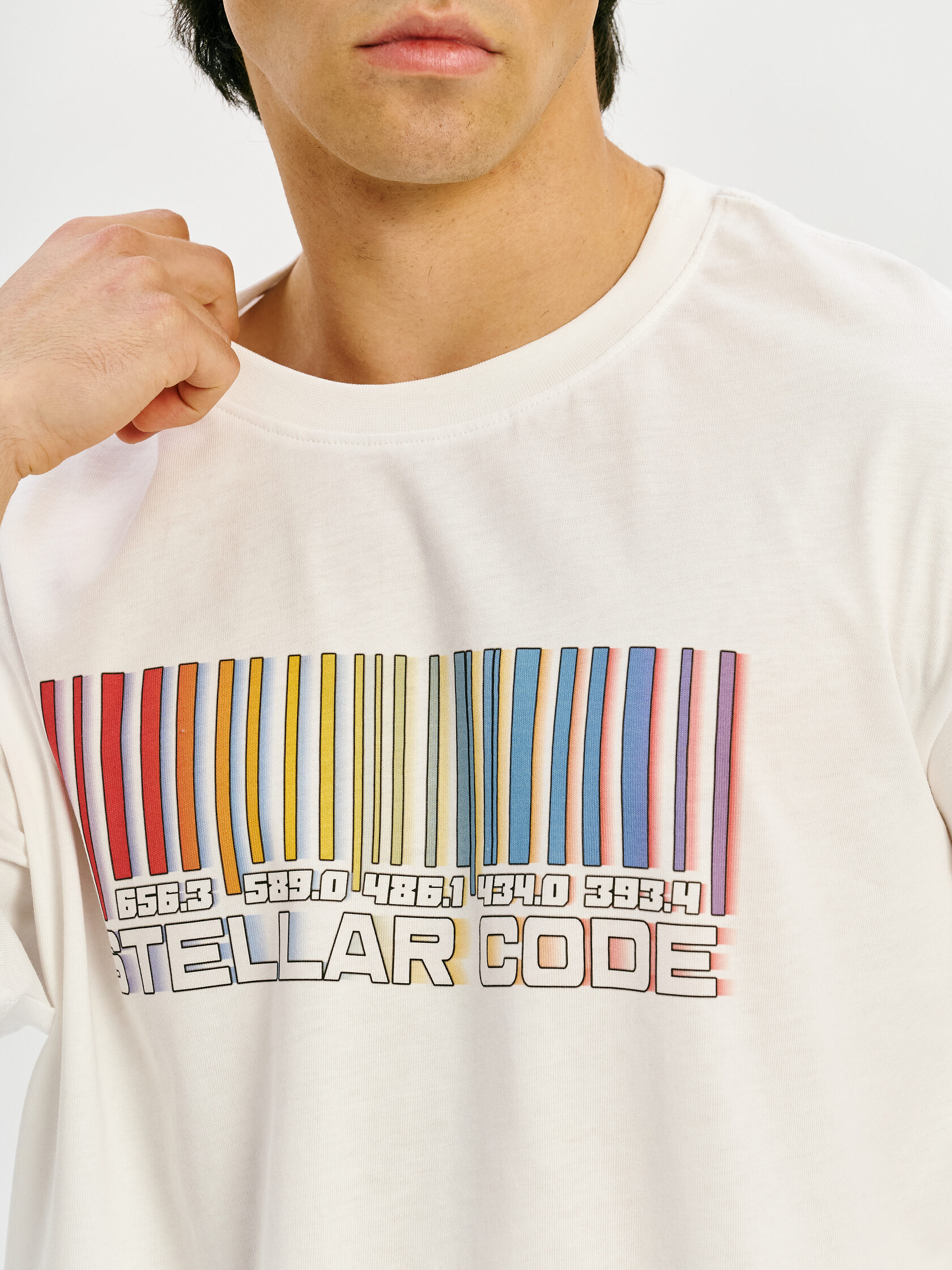 Футболка с принтом, основанным на спектре звезды — её уникальном энергетическом профиле. Визуальный мотив напоминает штрихкод, но в основе — реальные данные из спектроскопии. Графика отсылает к астрономии и аналитике света как способу познания Вселенной.
