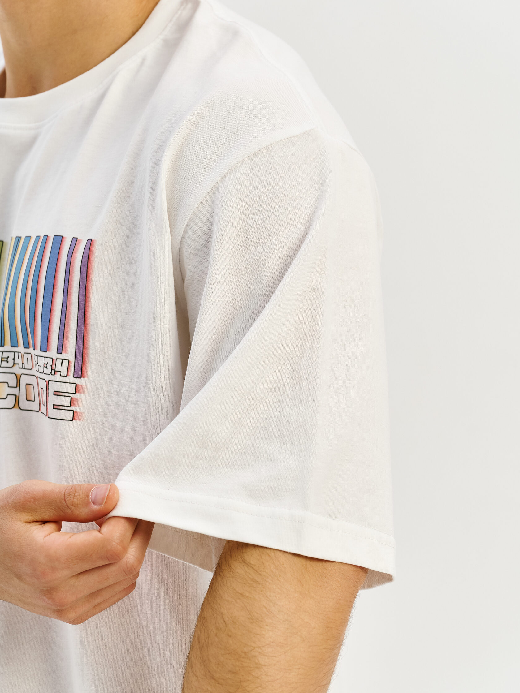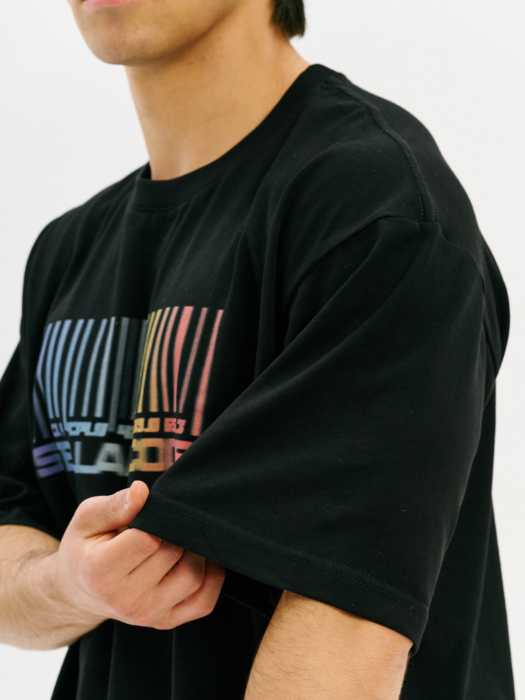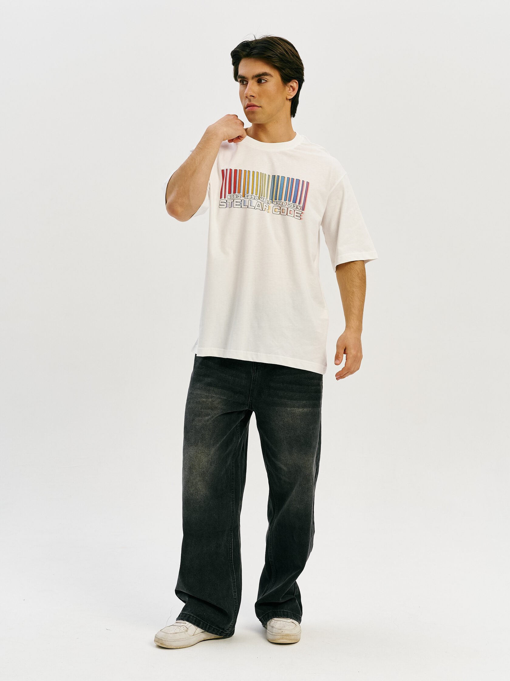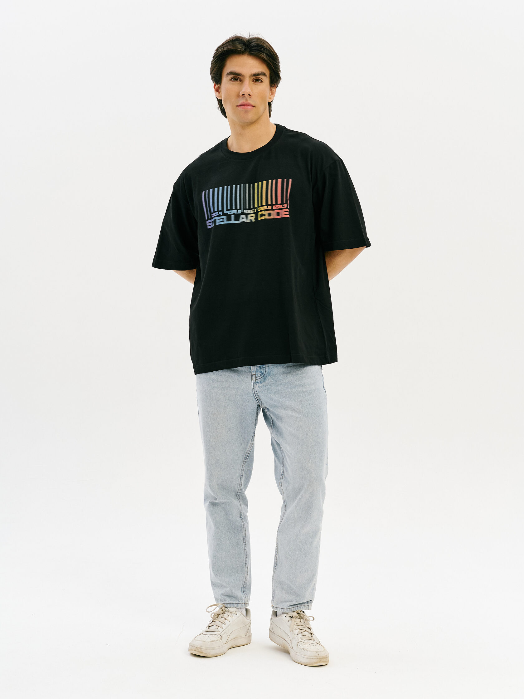 Футболка с принтом, основанным на спектре звезды — её уникальном энергетическом профиле. Визуальный мотив напоминает штрихкод, но в основе — реальные данные из спектроскопии. Графика отсылает к астрономии и аналитике света как способу познания Вселенной.