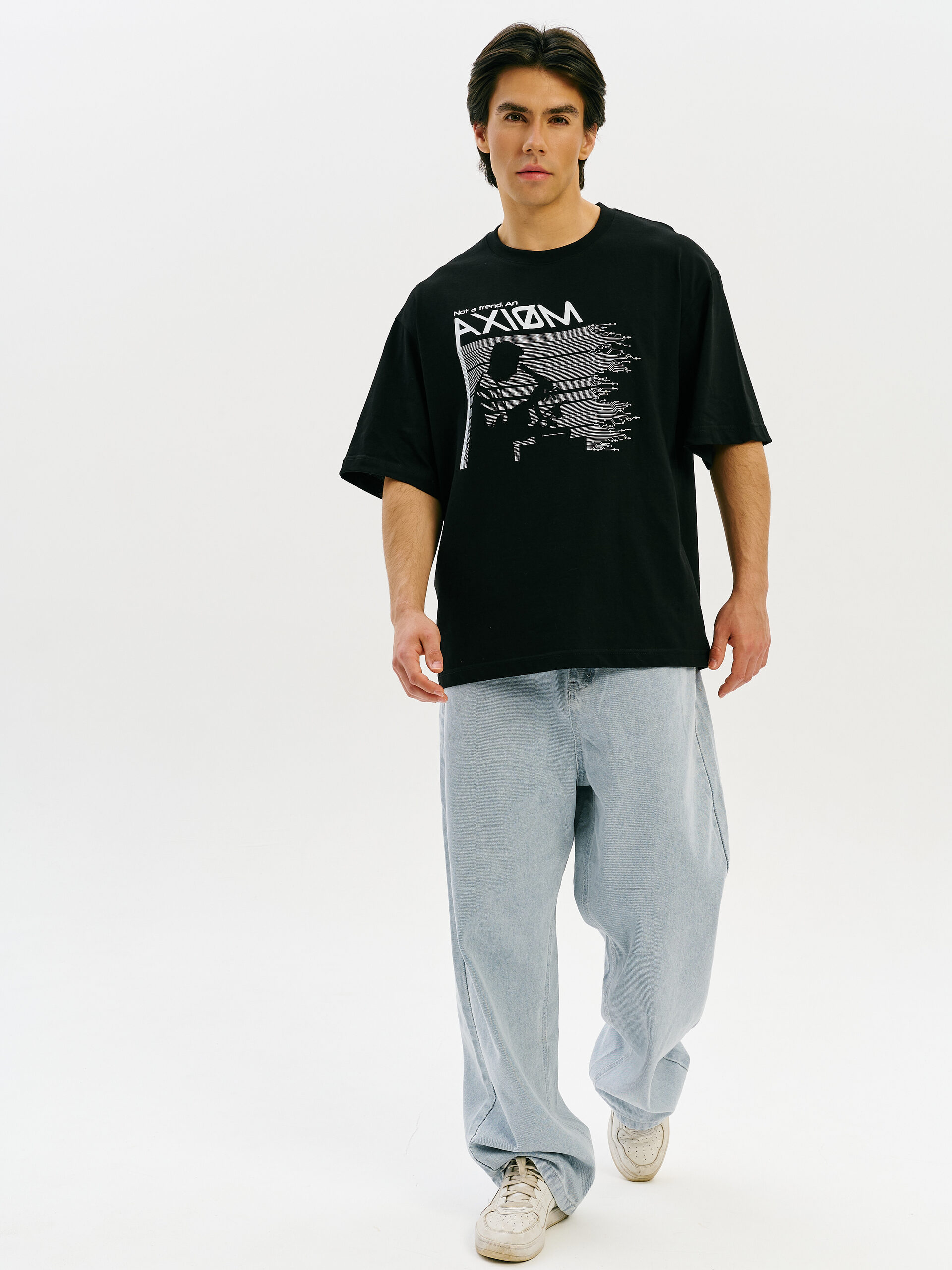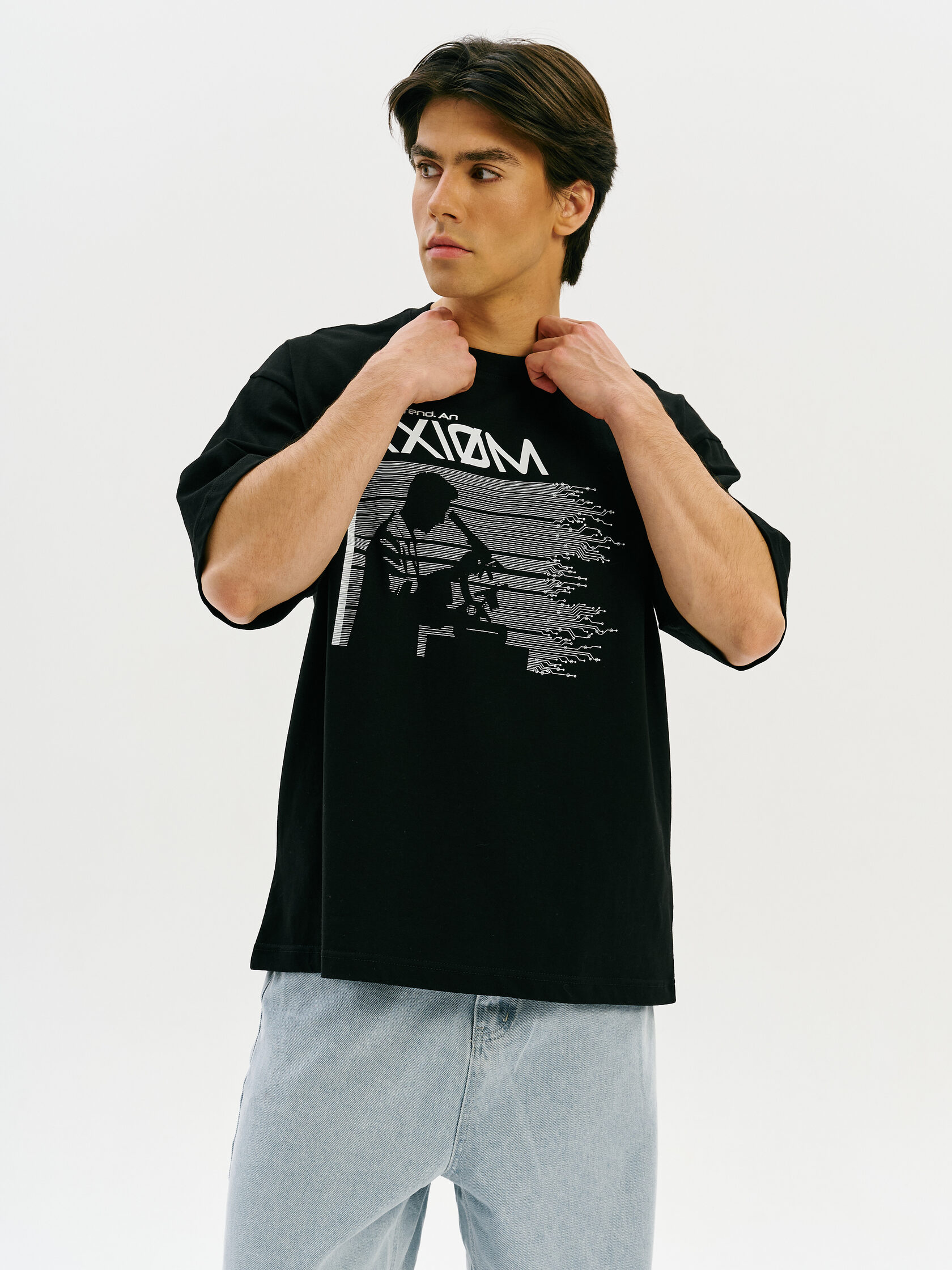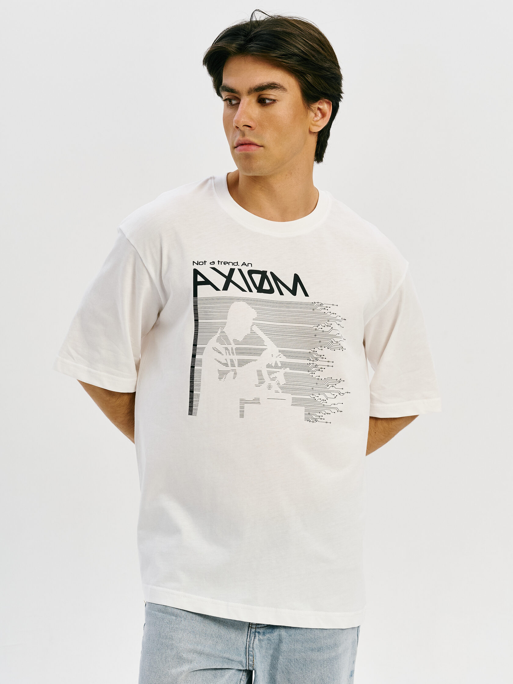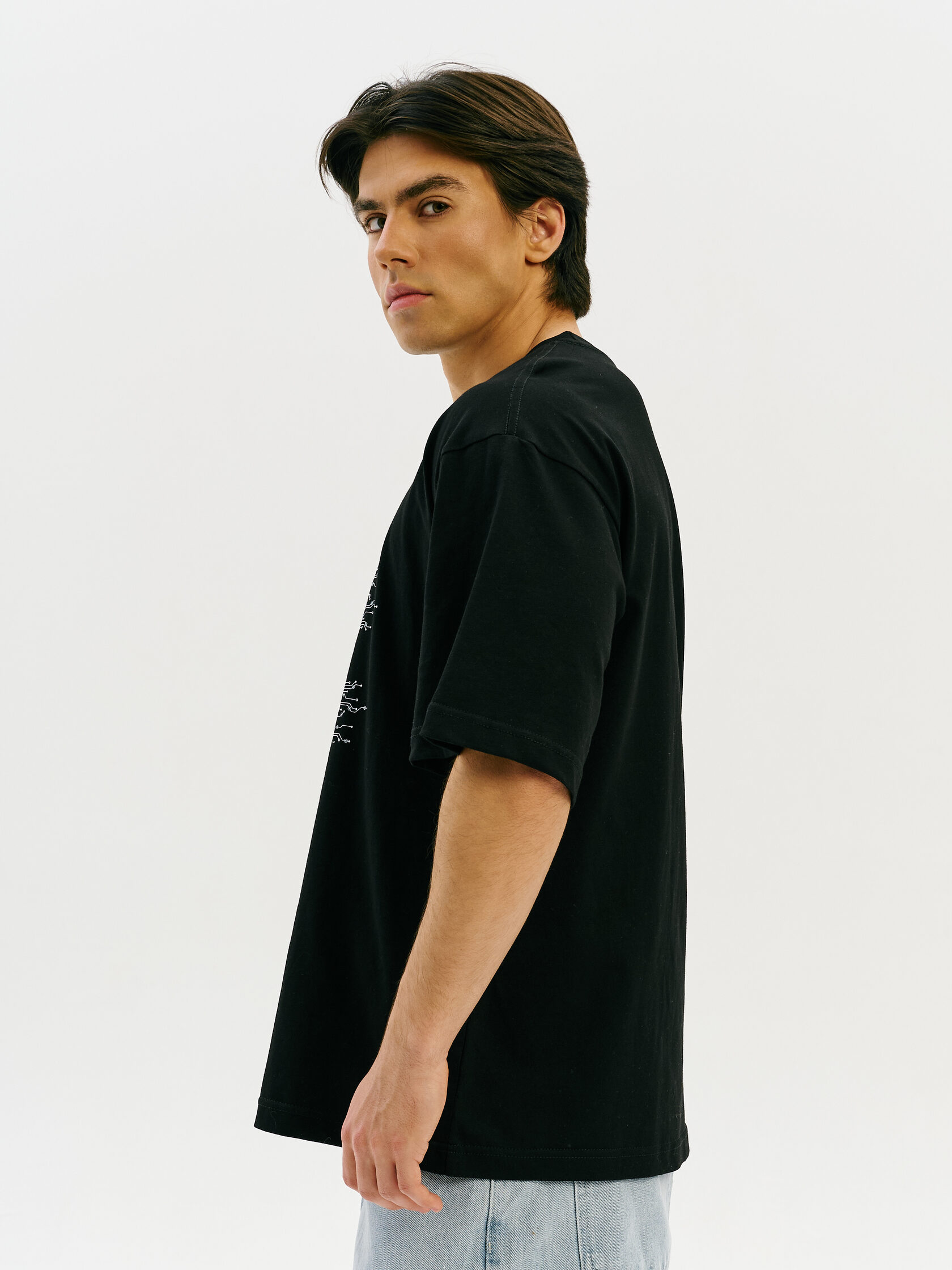 Футболка с принтом, основанным на спектре звезды — её уникальном энергетическом профиле. Визуальный мотив напоминает штрихкод, но в основе — реальные данные из спектроскопии. Графика отсылает к астрономии и аналитике света как способу познания Вселенной.