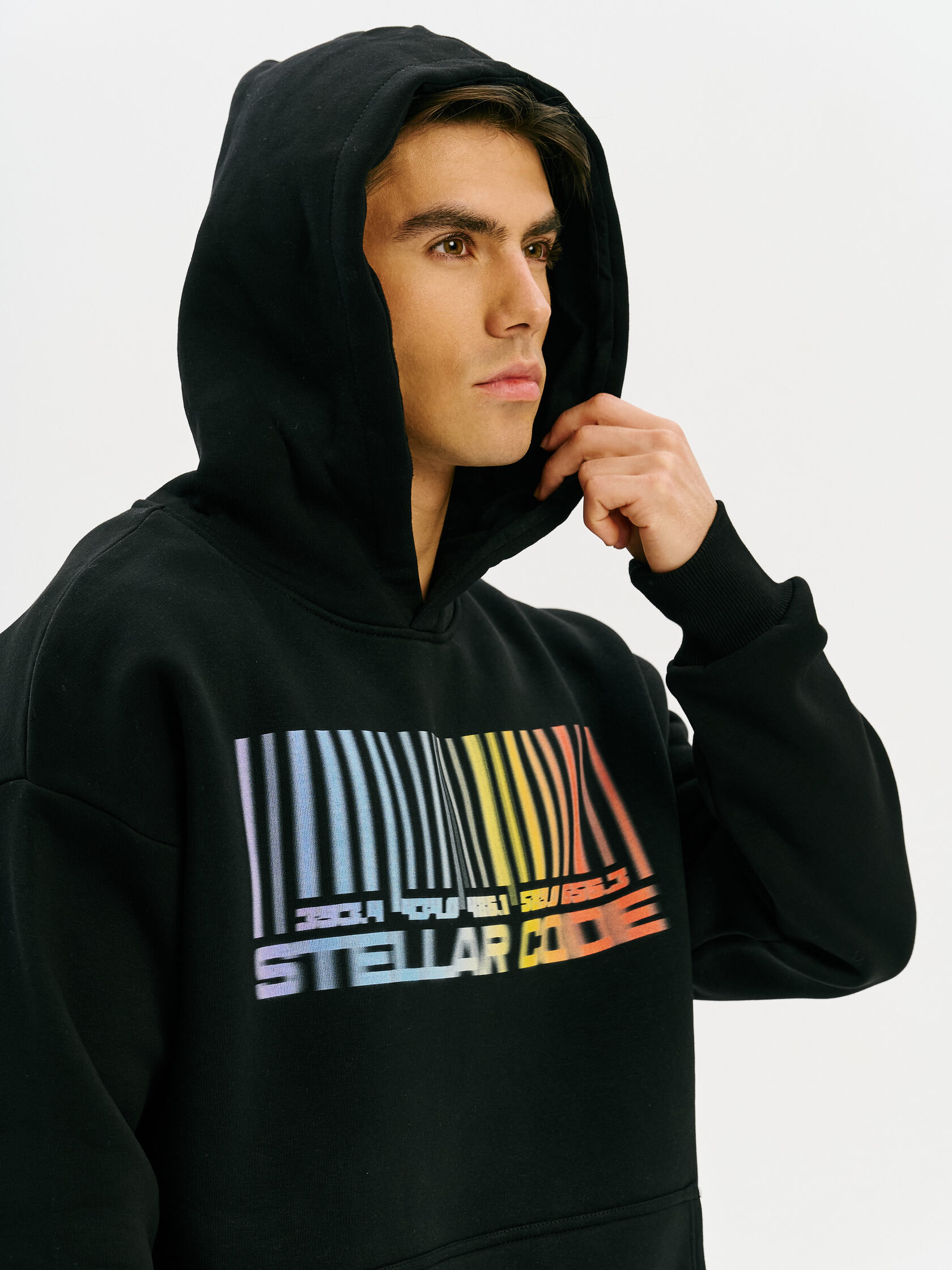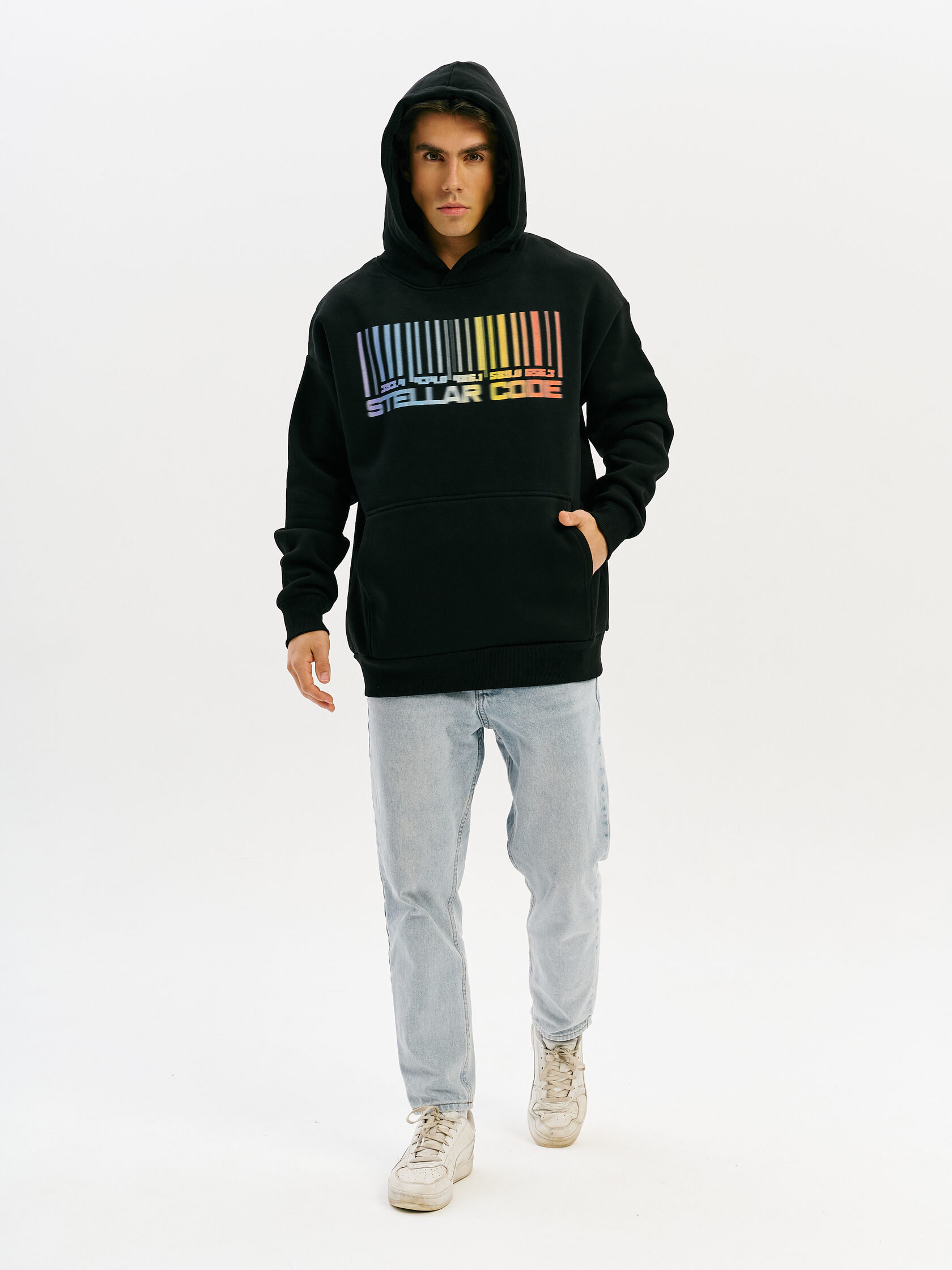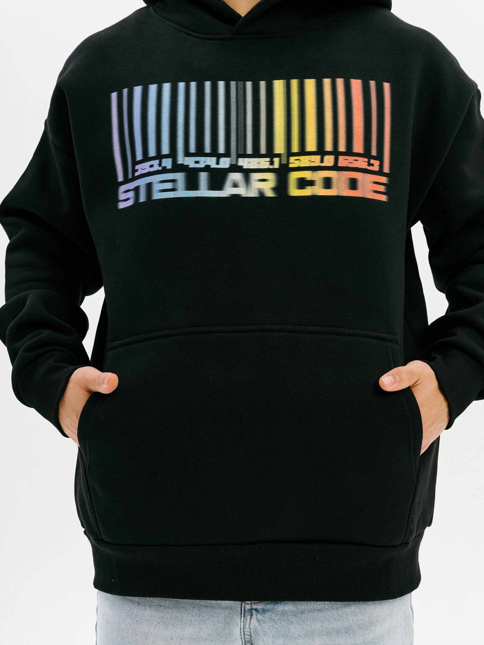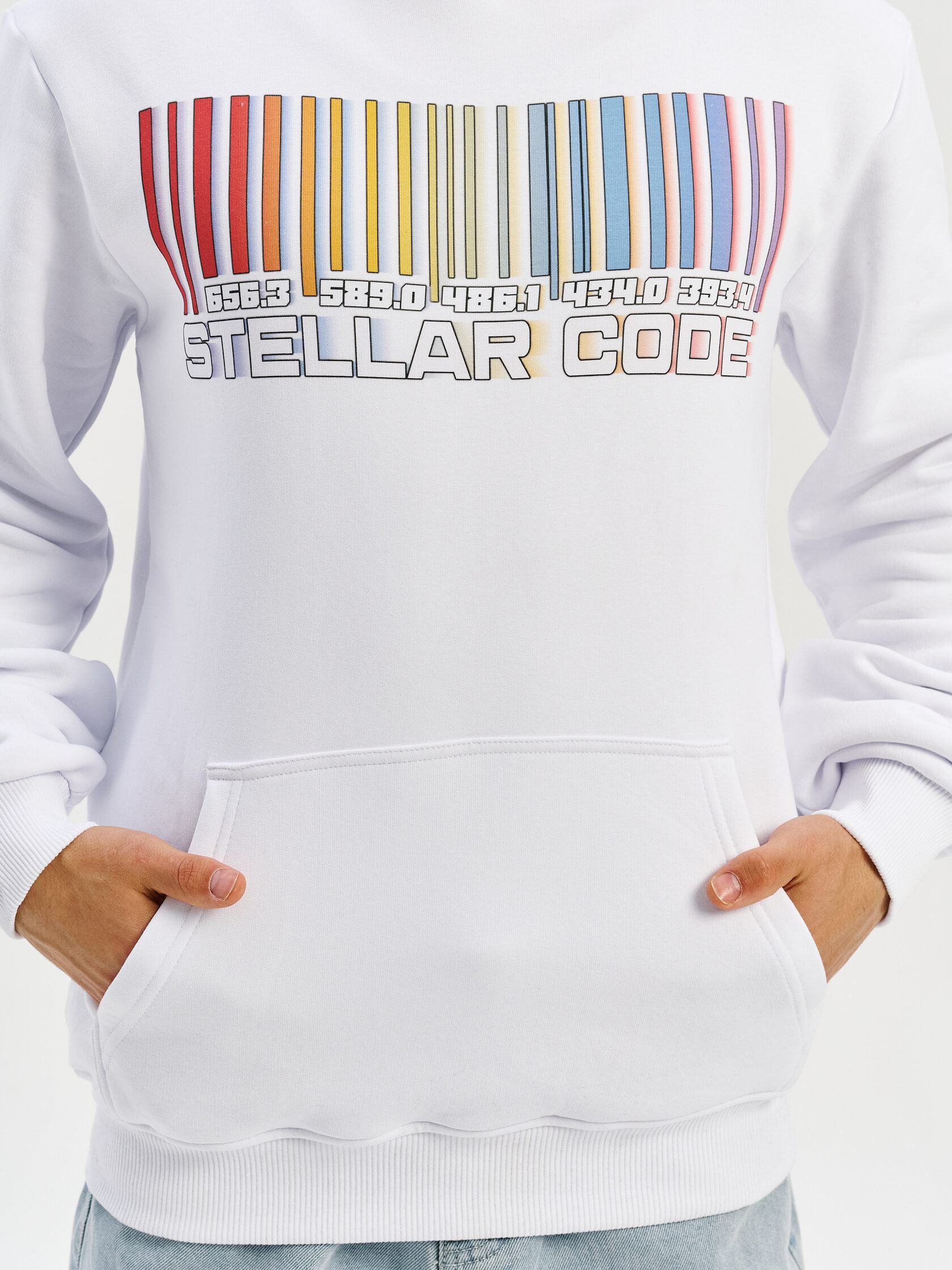 Худи с графикой, вдохновлённой спектром звезды — визуальной записью света, прошедшего сквозь космос. Абстрактная форма, напоминающая штрихкод, отсылает к методам научного наблюдения и скрытому порядку Вселенной.