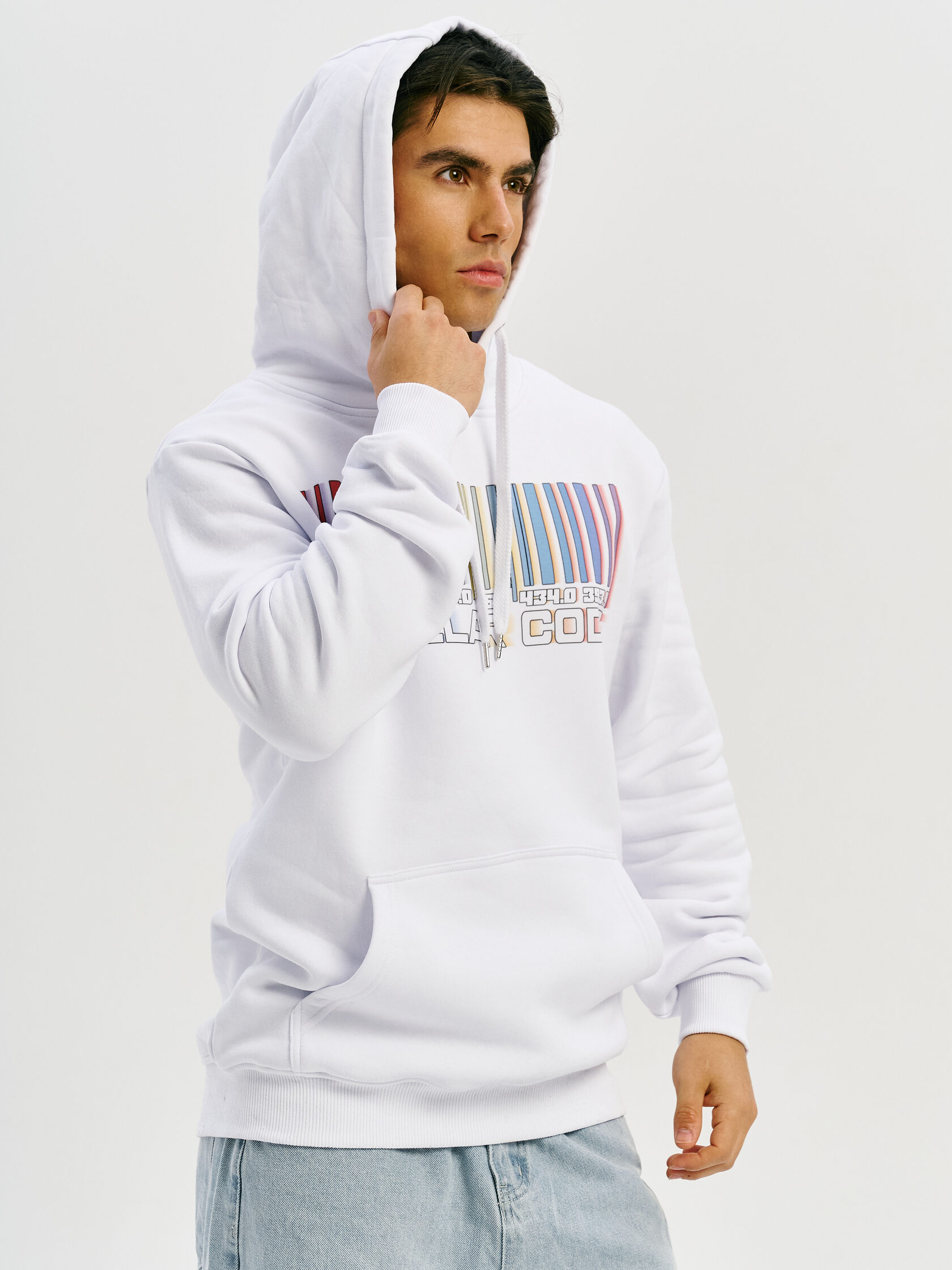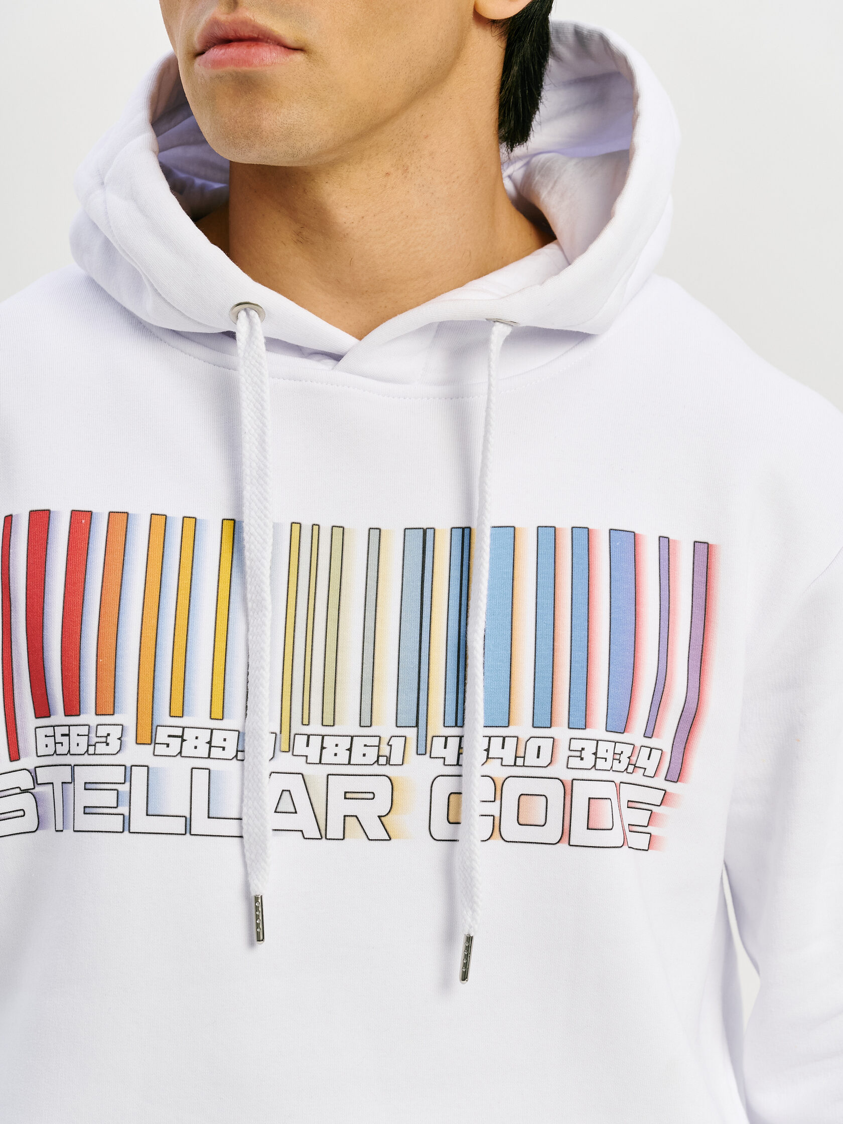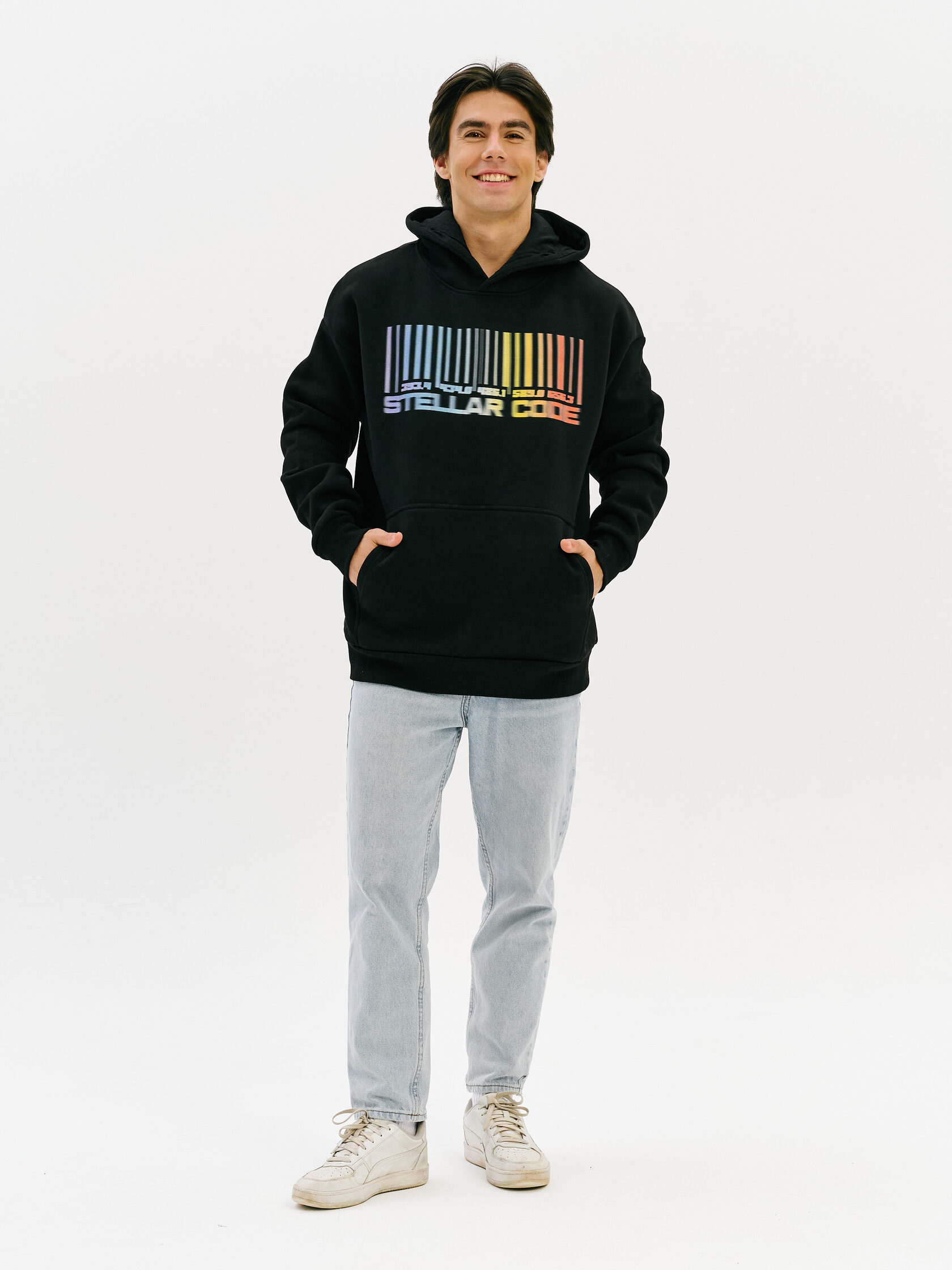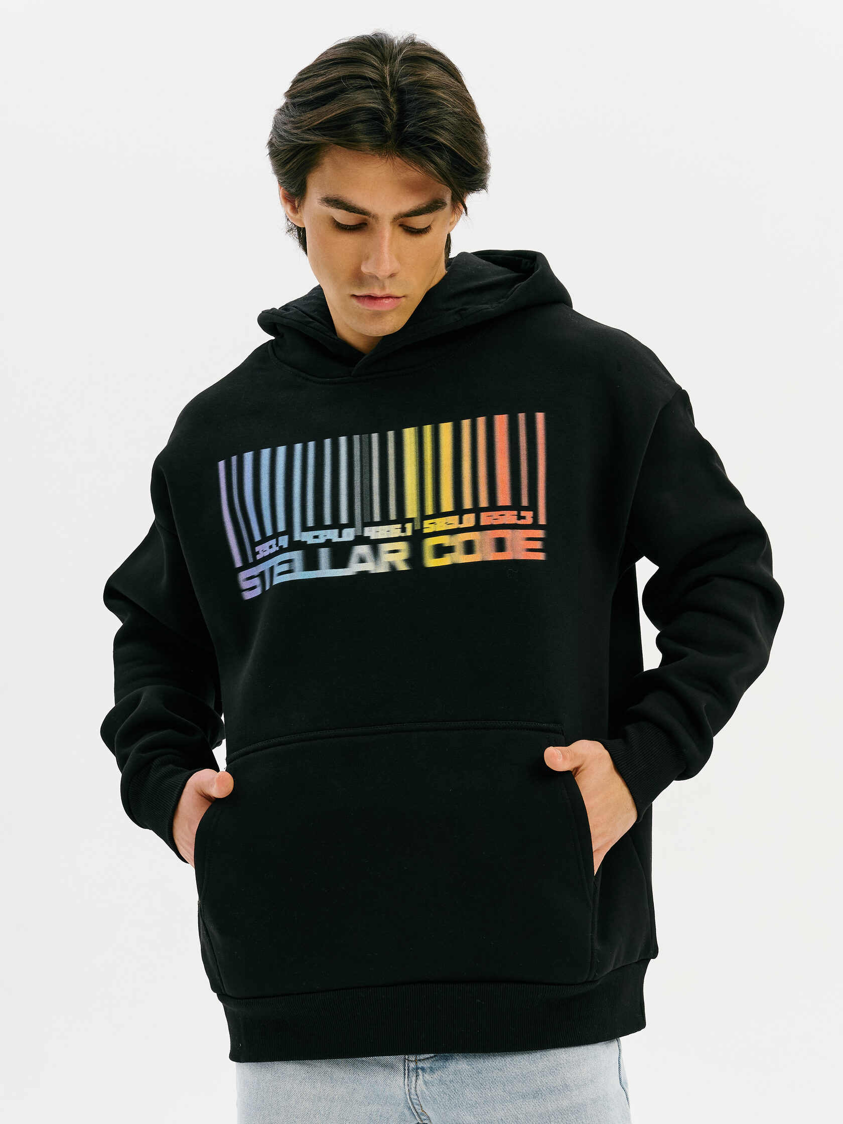 Худи с графикой, вдохновлённой спектром звезды — визуальной записью света, прошедшего сквозь космос. Абстрактная форма, напоминающая штрихкод, отсылает к методам научного наблюдения и скрытому порядку Вселенной.