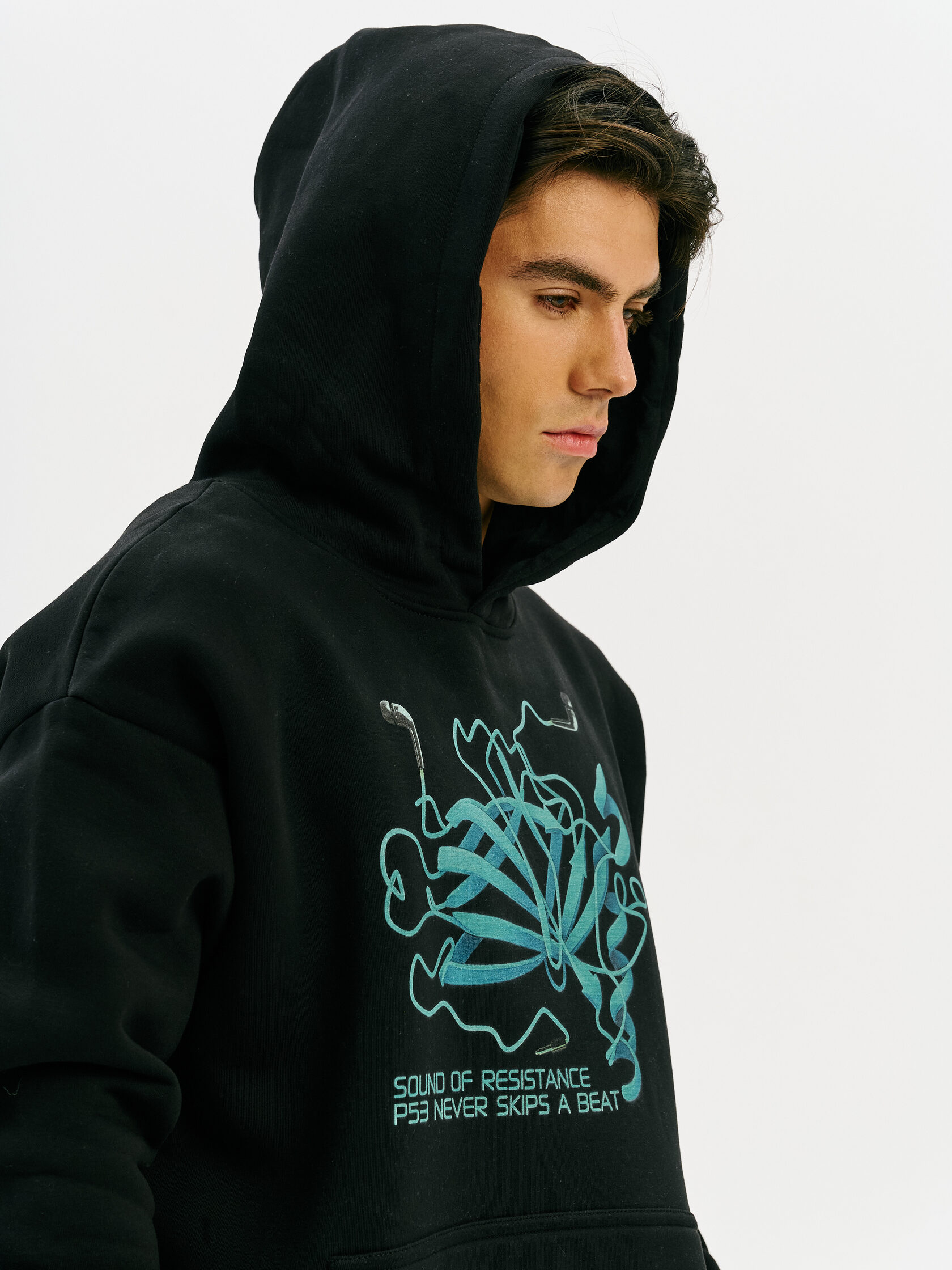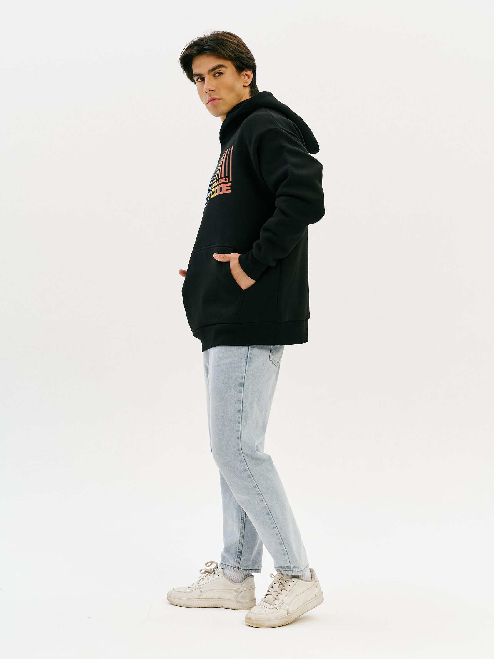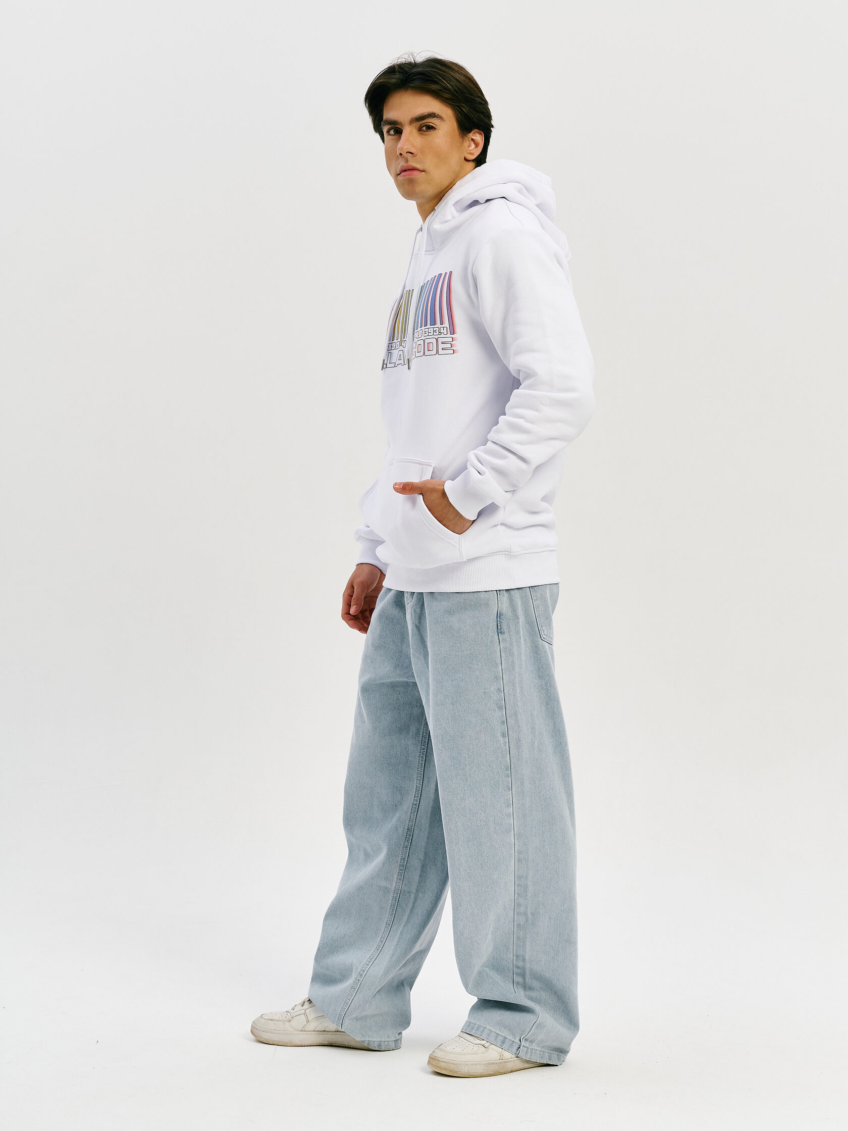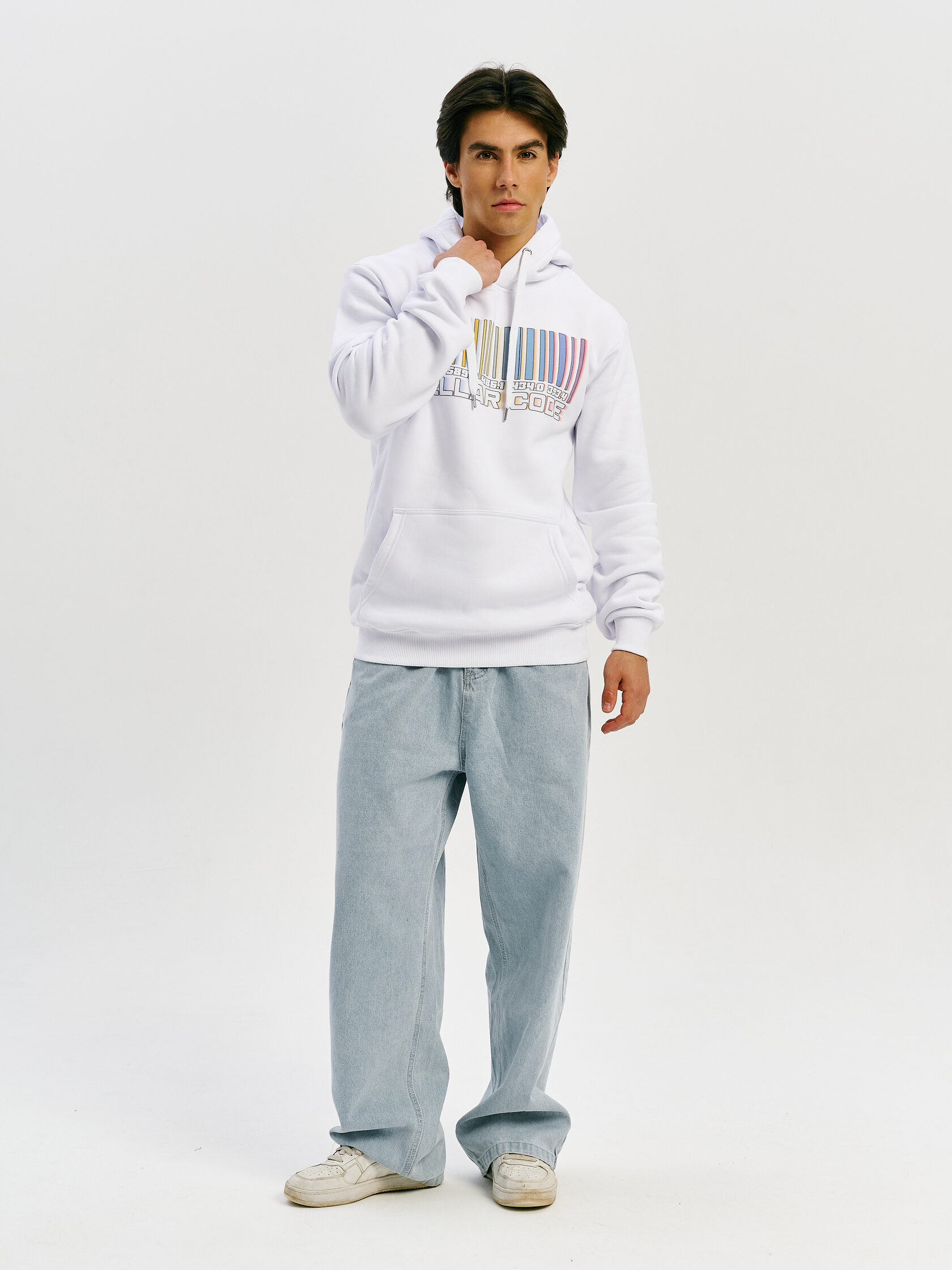Худи с графикой, вдохновлённой спектром звезды — визуальной записью света, прошедшего сквозь космос. Абстрактная форма, напоминающая штрихкод, отсылает к методам научного наблюдения и скрытому порядку Вселенной.