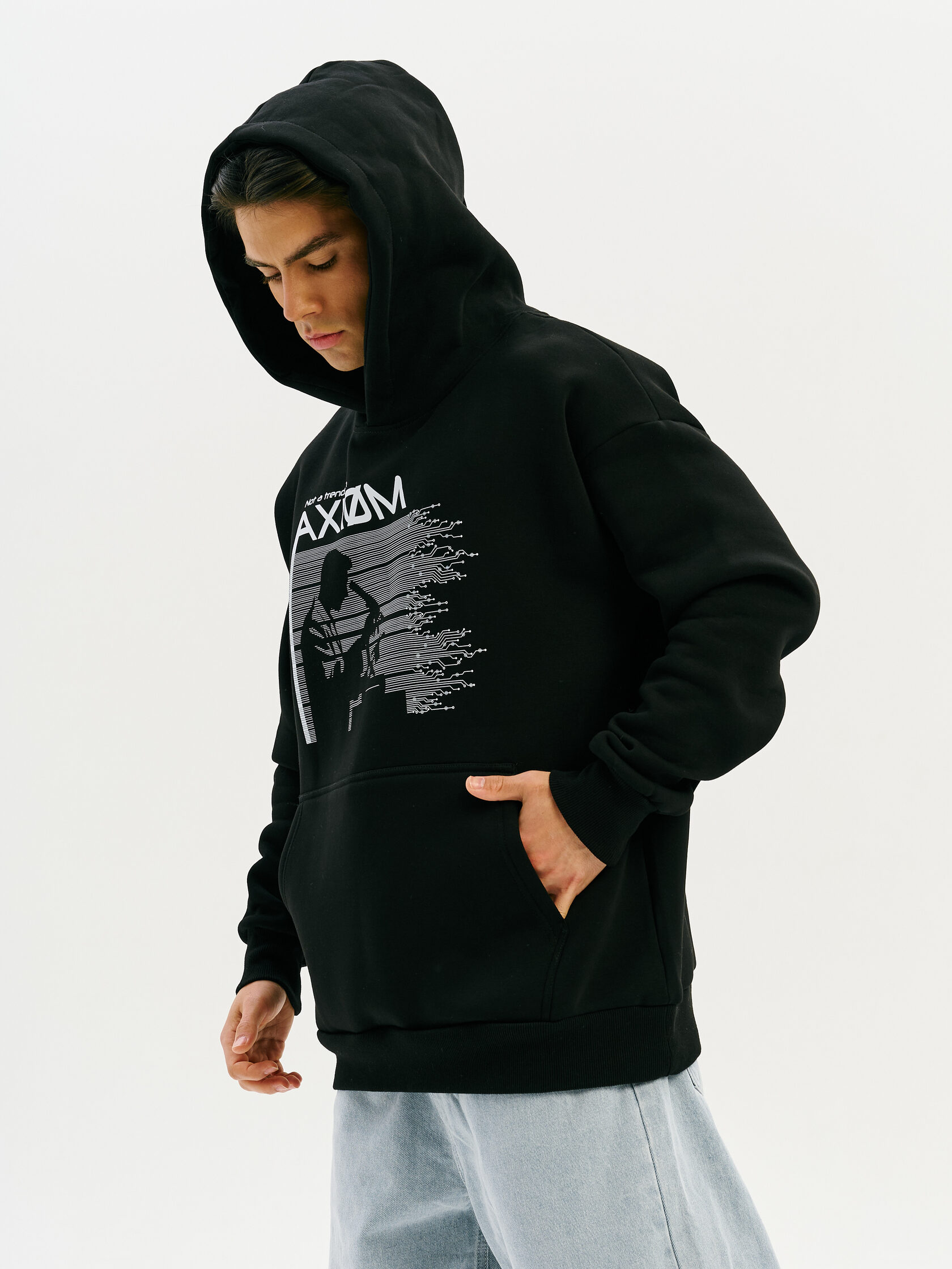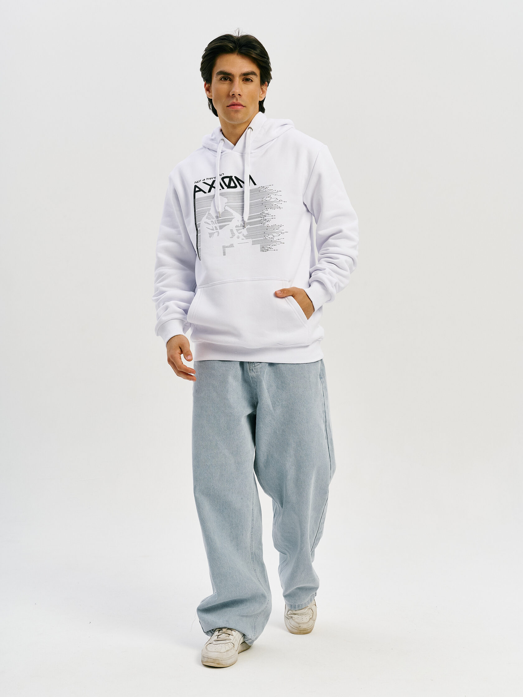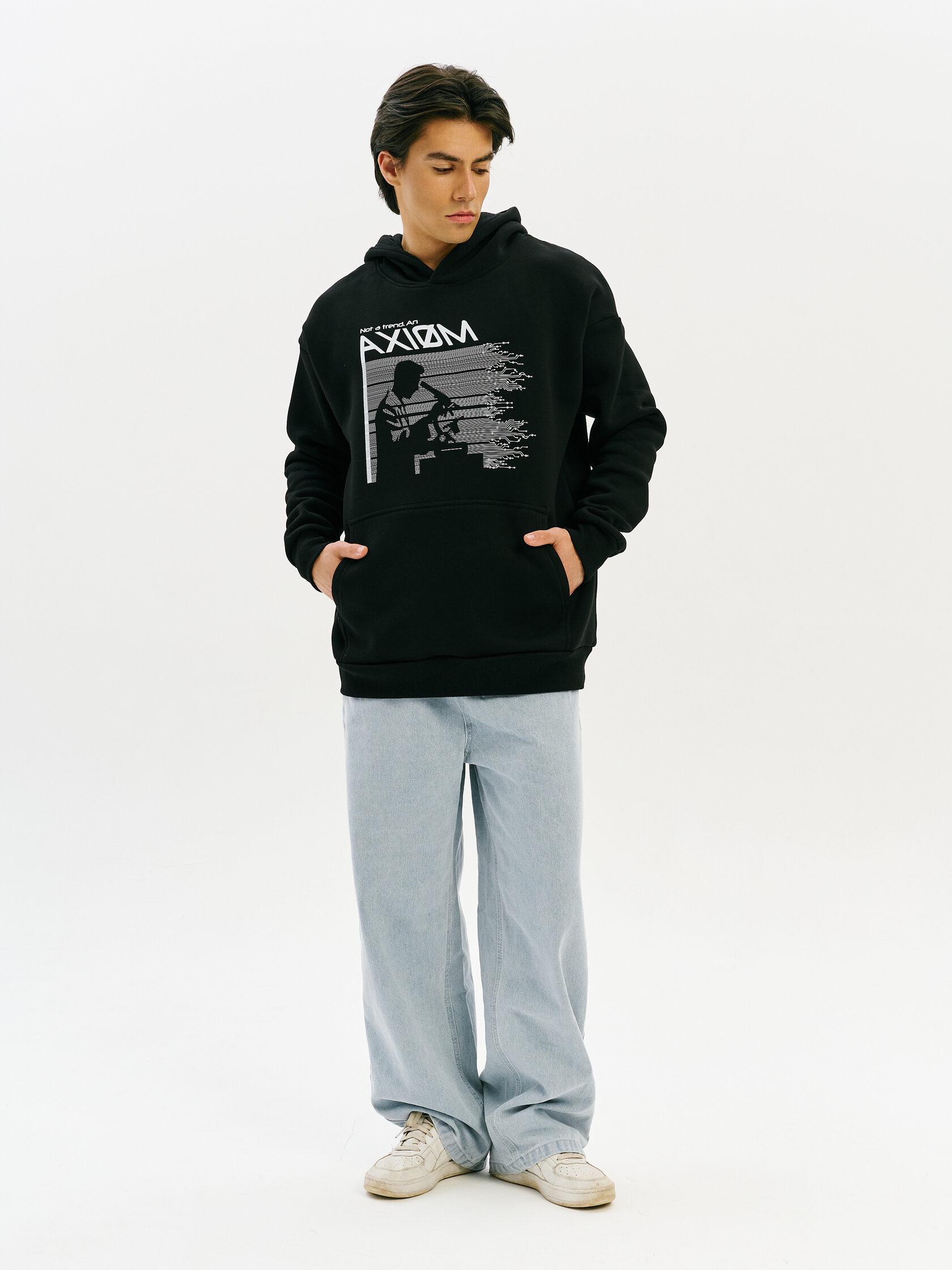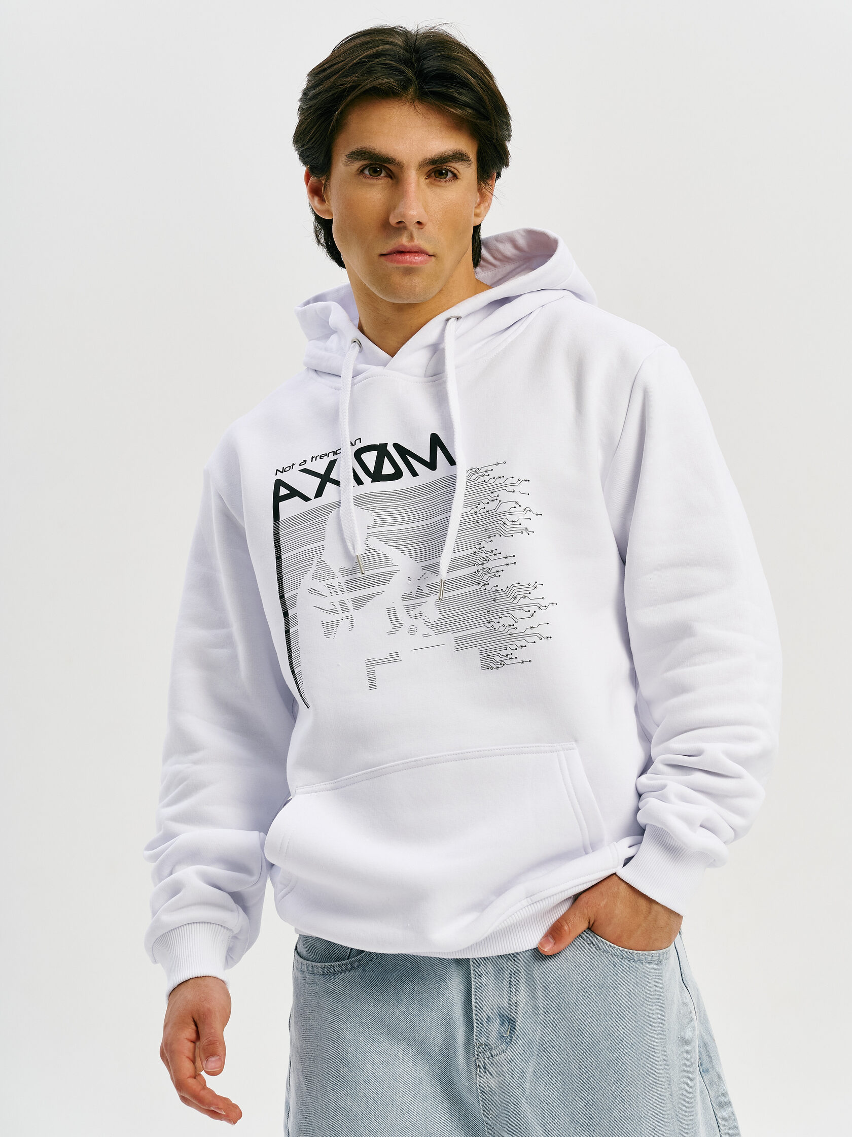 Базовое худи с акцентом на технологичную эстетику. Универсальный силуэт и гладкая поверхность ткани делают его основой для любого образа — от лаборатории до улицы.