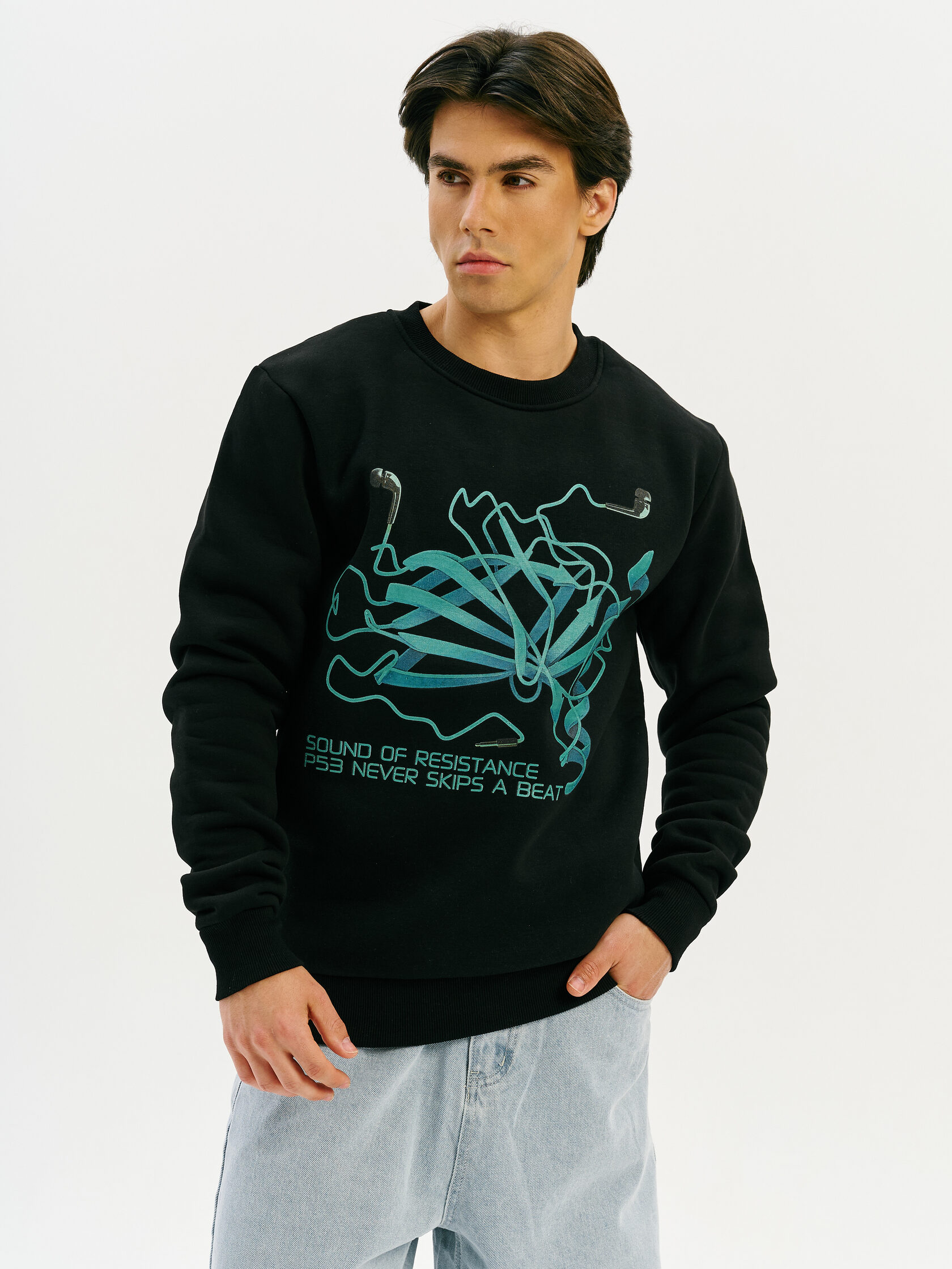 Свитшот, вдохновлённый молекулярной биологией и ключевым белком p53 — природным механизмом клеточной защиты. Графика — напоминание о внутренних процессах, которые поддерживают стабильность и сопротивление разрушению.