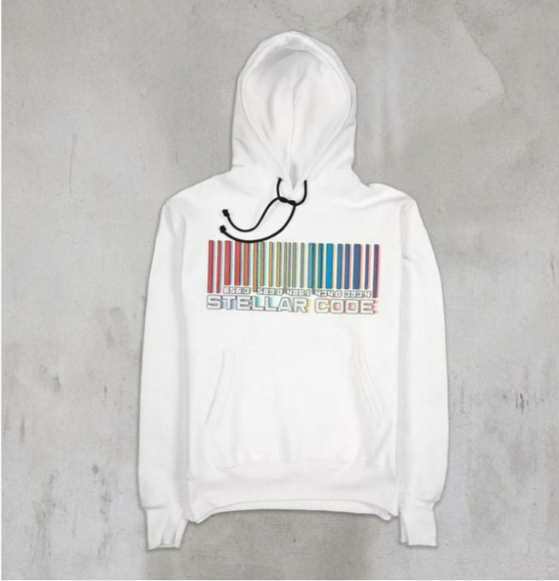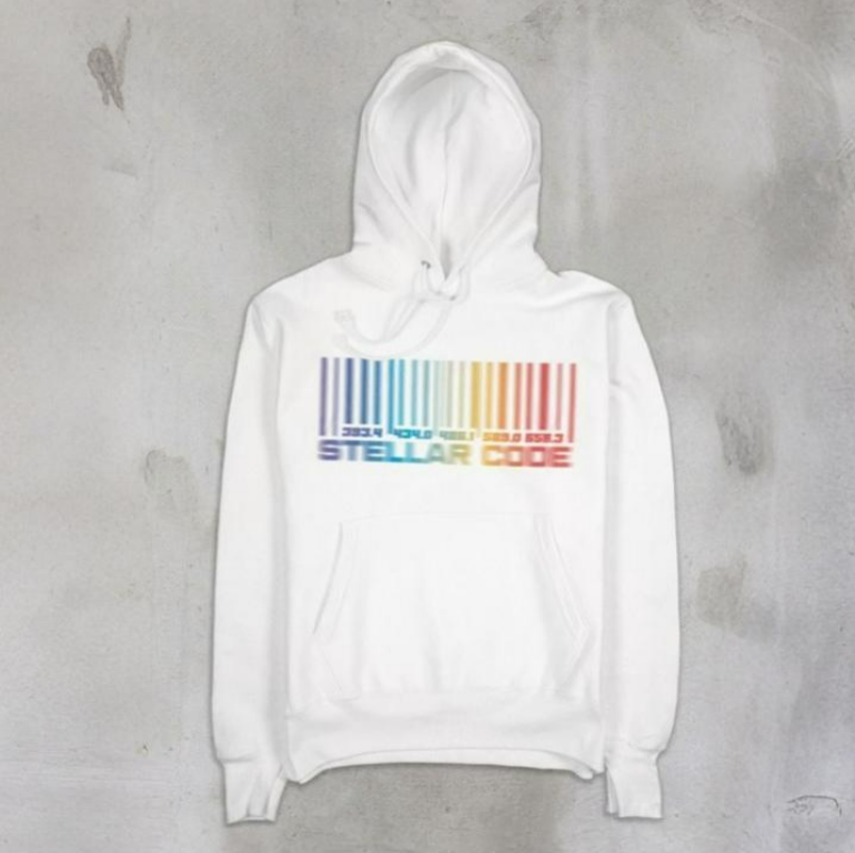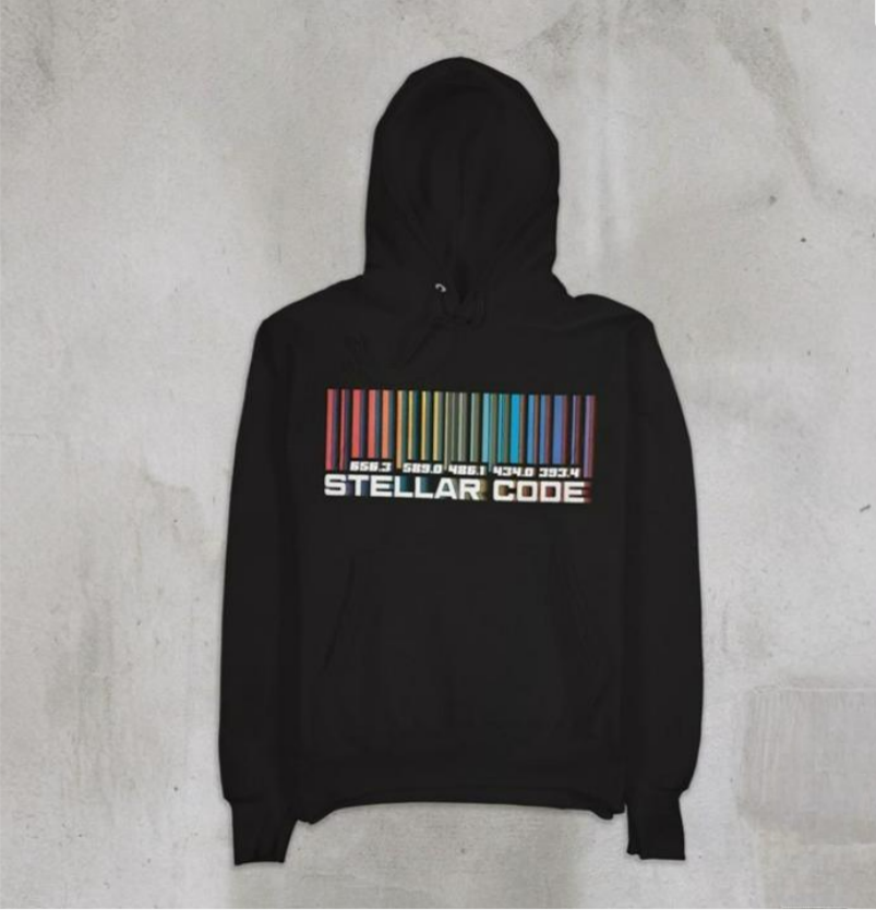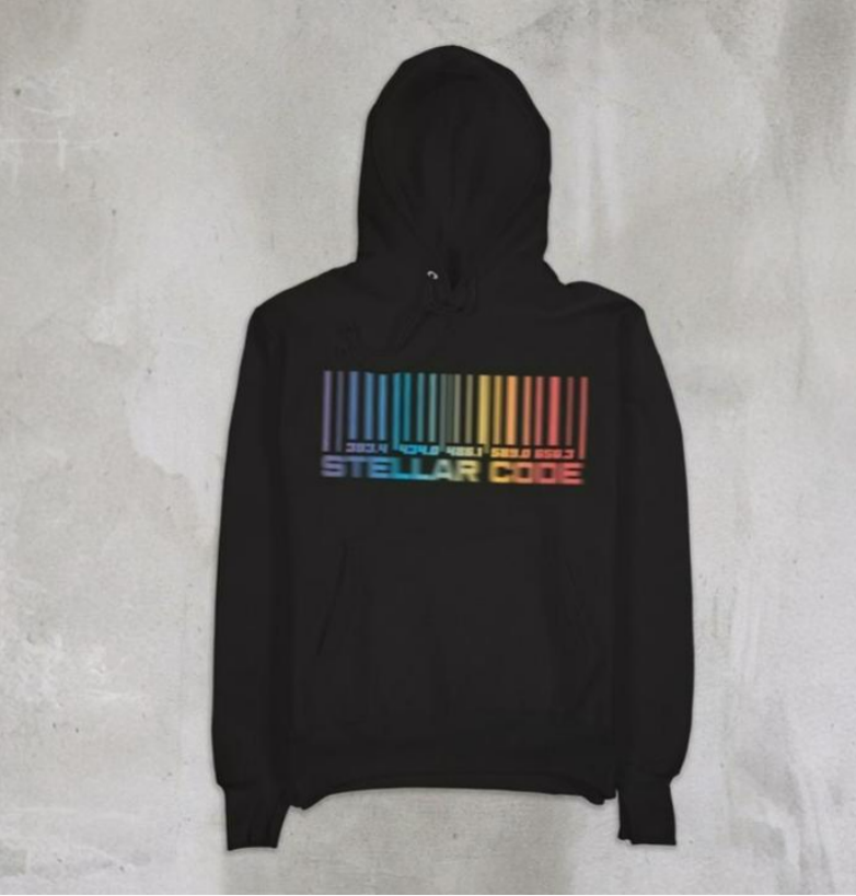 Худи с графикой, вдохновлённой спектром звезды — визуальной записью света, прошедшего сквозь космос. Абстрактная форма, напоминающая штрихкод, отсылает к методам научного наблюдения и скрытому порядку Вселенной.
