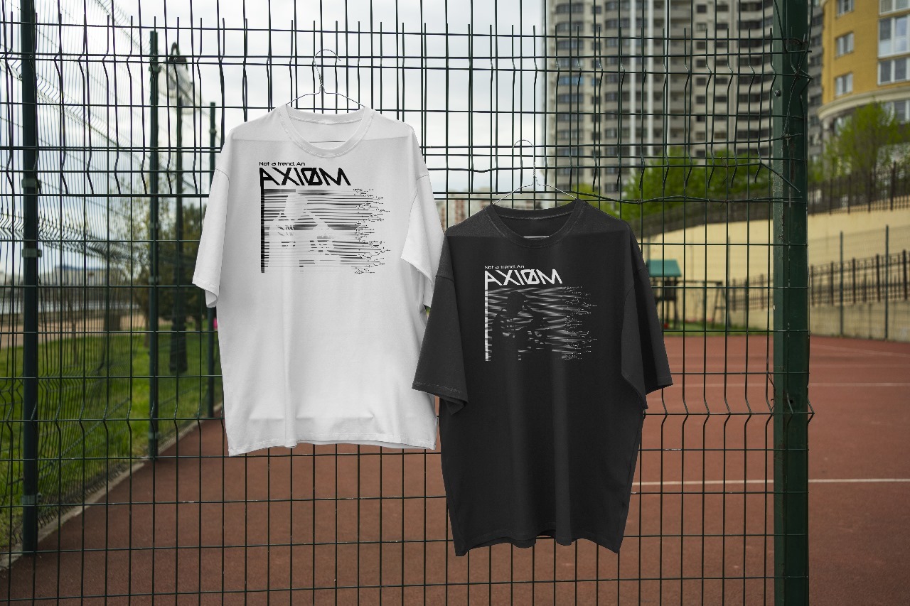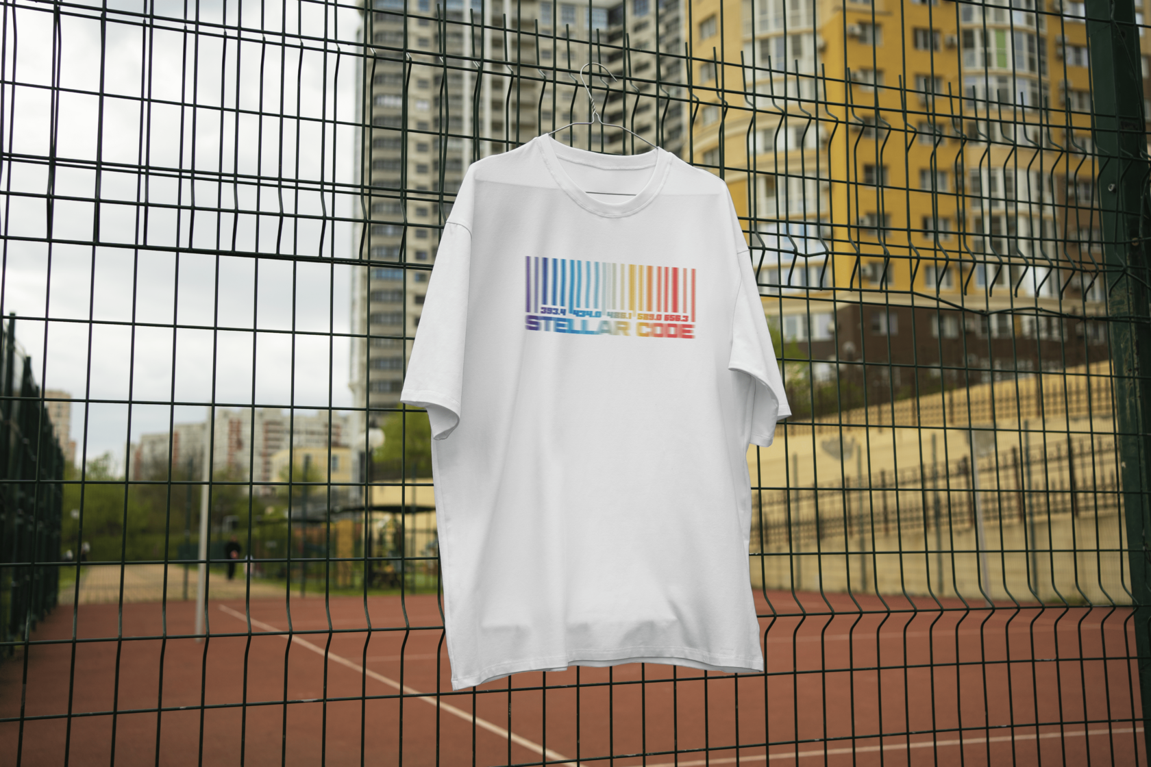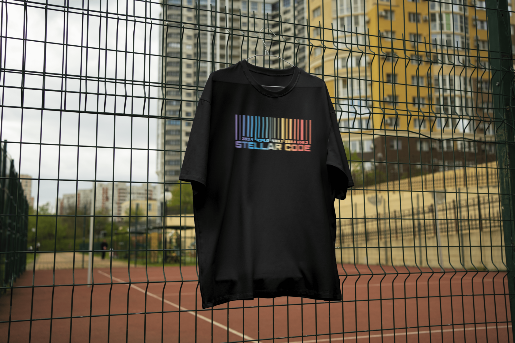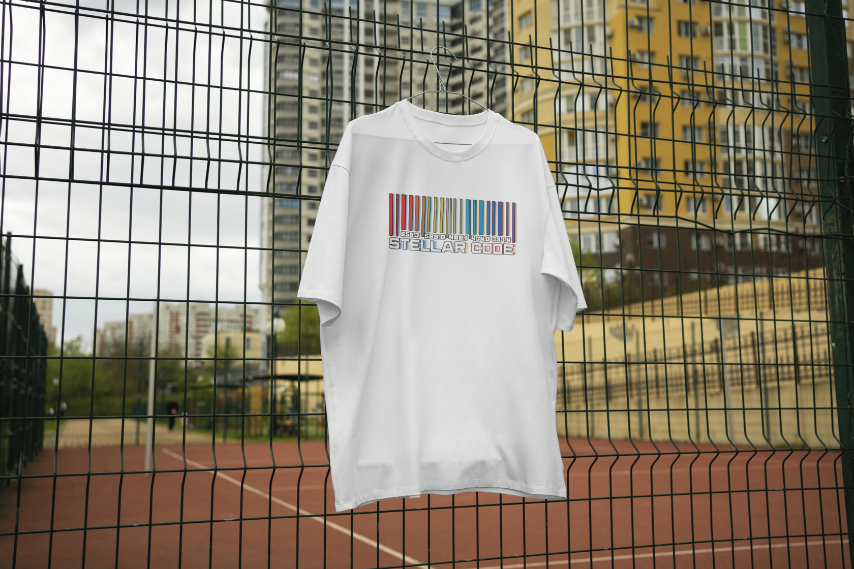 Футболка с принтом, основанным на спектре звезды — её уникальном энергетическом профиле. Визуальный мотив напоминает штрихкод, но в основе — реальные данные из спектроскопии. Графика отсылает к астрономии и аналитике света как способу познания Вселенной.